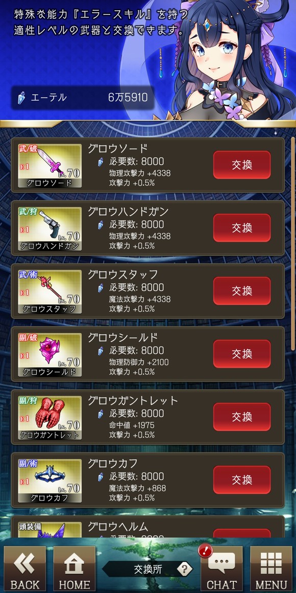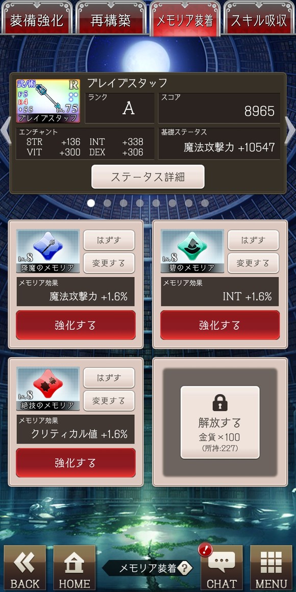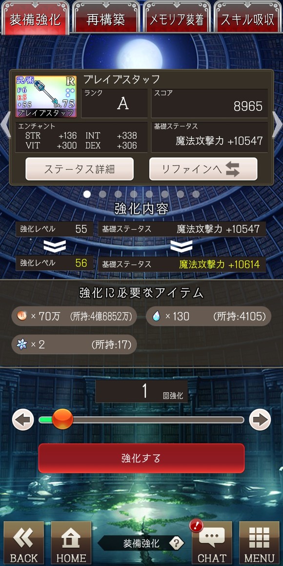 装备管理的第一栏是装备升级,上限取决于玩家的等级,50级以下的升级只需要消耗月の雫,之后升级需要月之结晶。这两种道具有很多获取手段,建议时不时看一下氪金商店,碰到直接花铜币买的就买下来