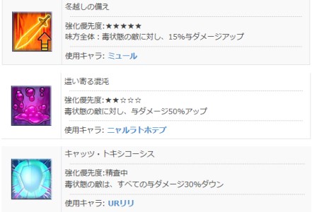 还有一点可以说的就是目前比较流行的成套队伍是火伤队和中毒队,我图里的队伍一方面是可能大部分玩家练人的时候没有规划不知道卡池轮替的普通队伍编成举例,另一方面是我当时没有抽龙娘火伤队没有核心(捂脸)。不管火伤队还是中毒队,编队思路和正常编成是一样的,都是输出debuff奶,但是核心是靠角色的被动组合,比如对火伤/中毒角色伤害上升,受到火伤/中毒角色伤害下降,以中毒队伍举例:只要给对面套上中毒,这几个组起来就是己方72.5%的伤害上升敌方30%的伤害下降,非常的强!值得一提的是同类buff肯定是按乘法叠加而不是加法,但是叠加上限未知,而且游戏的具体公式没法得知只能按一般经验判断。那么为什么主流是火伤队不是中毒队呢,主要原因是中毒队的核心是ur莉莉,没有错就是每日轮替那个免费抽的ssr莉莉的ur版,但是要ur化她相对火伤队的较多ur角色较困难所以中毒队要比火伤队少见的多。类似的buff还有病気黑暗气绝之类等等,但是目前难以成队。