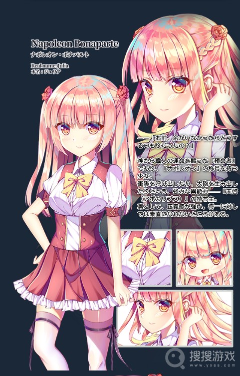 拿破仑少女这款游戏的全称叫做拿破仑少女字典里没有不可能三个字的少女,是一款以视角小说题材制作的模拟文字类剧情游戏。在这里玩家将扮演成为主角咲川将一,你将会因为一次意外穿越到19世纪的法国。在这里你将遇到女性版的拿破仑大帝,你需要与他互动合作一起进行一场围绕世界的探索旅程。