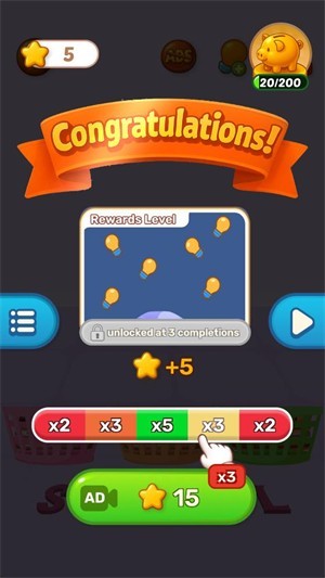 3、将所有物品全部摆放整齐后就可以通关,通关会获得星星奖励。