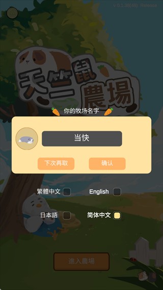 1、游戏一开始,先为自己的牧场取一个独一无二又好听的名字,开启你的天竺鼠庄园生活!