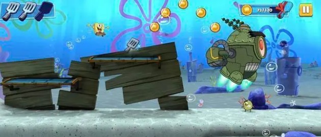 4、在每一个关卡的最后,玩家都必须和该场景的皮老板表兄弟来一场PK 赛!游戏过程中除了要躲避一系列障碍物以外,表兄弟们会在与海绵宝宝的追逐过程中投放爆炸物,玩家可以通过「冲刺」技巧来把这些爆炸物撞回给表兄弟们。当表兄弟们下方血条归零时,挑战就成功了!