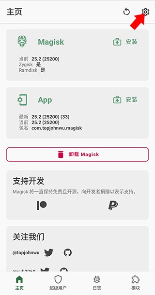 2、接着就是配置屏蔽列表了,与上方24.2版本类似但又有些不同,首先来到Magisk首页,点击上方的设置按钮