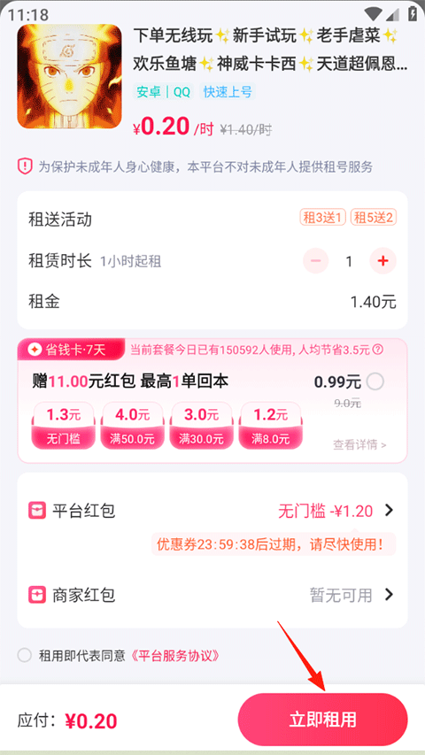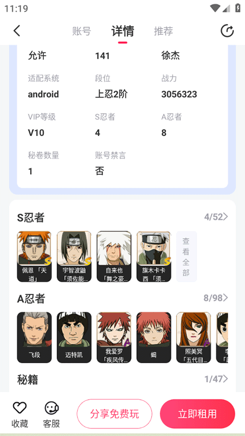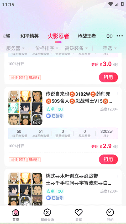 2、往下滑动选择一款品相、价格合适的账号点击租用;