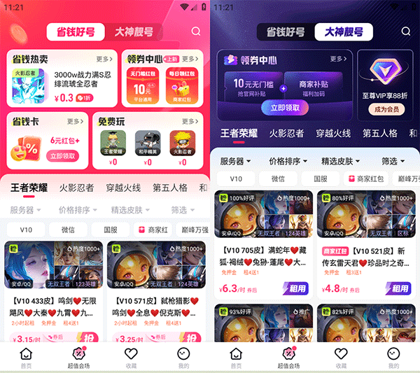 5、最后在超值会场页面还可以领取优惠券,拼手速享受极品折扣大神靓号。