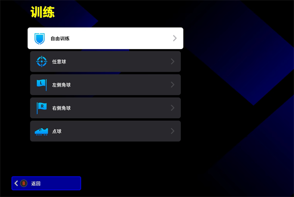 2、新手玩家对游戏不熟悉,可以点击“额外选项”,再点击“训练”,可以进行自由训练、任意球训练、左侧角球训练、右侧角角球以及点球训练