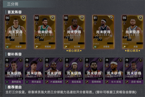推荐理由:主打三分投篮,依靠球员强大的三分球能力迅速拉开分差取胜。(替补可根据工资帽自由替换)