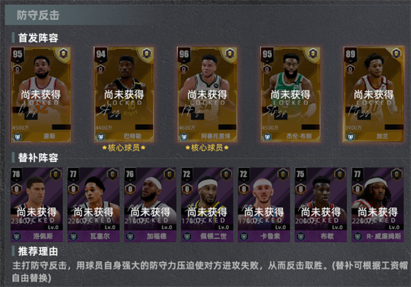 推荐理由:主打防守反击,用球员自身强大的防守力压迫对方进攻失败,从而反击取胜。(替补可根据工资帽自由替换)
