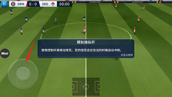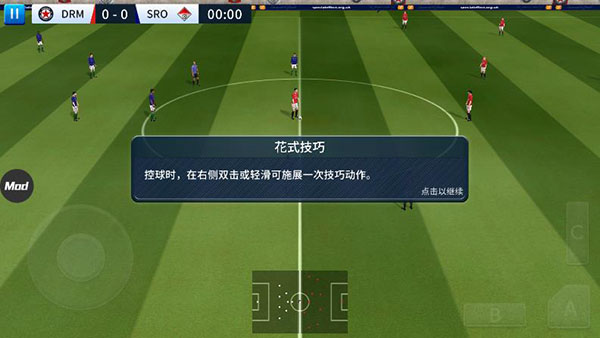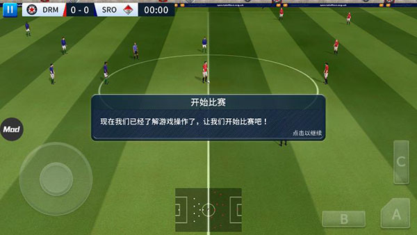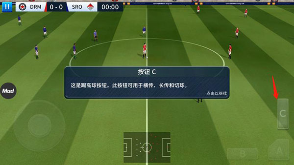 屏幕左下角是虚拟摇杆,操控带球队员的方向。在我们需要吊球时,小编推荐我们要使用右下角的“C”键。