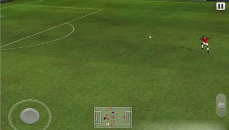 屏幕左下角是虚拟摇杆,操控带球队员的方向。而在射门时,小编推荐我们要使用右下角的“A”键。长按“A”键,队员头上会出现红色进度条,从无到满只有一次机会。进度条表示力度。力度越大,球速越快。