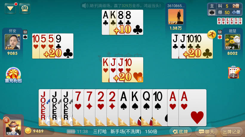 三打哈扑克玩法起源于湖南,使用两副牌1V3的四人游戏,玩法与升级、拖拉机相似且游戏性更强.
