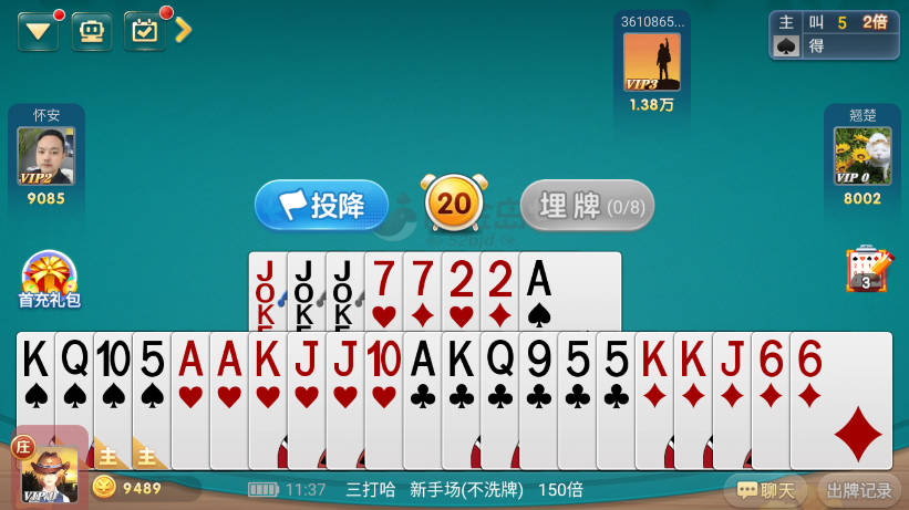 白金岛三打哈是一款深受牌友喜爱的湖南特色扑克牌游戏,玩法源自传统“三打一”,采用两副牌,由四名玩家对局,其中一人为庄家,其余三人为闲家,共同围绕“抓分”展开激烈对抗。与升级、拖拉机类似,但规则更加灵活,节奏更紧凑,对抗性更强。白金岛三打哈游戏中,王、2、7为常主,8张底牌增加了策略深度,合理搭配出牌,方能在激烈的对局中占据优势。闲家之间需默契配合,围剿庄家抢占分数,而庄家则需凭借牌技与运气,成功守住阵地,局势瞬息万变,每一局都充满挑战与悬念。