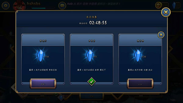 1、任务:在游戏的大厅页面点击任务可以查看每日任务,这里每天会为大家派出三个任务,完成任务后可以领取到相应的宝石奖励。