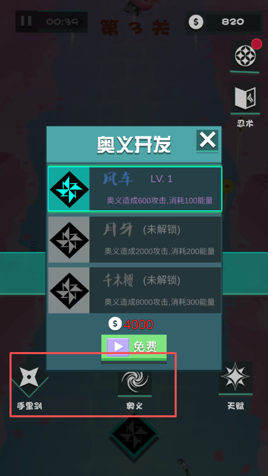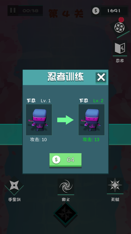 3、被击败的敌人会掉落金币,玩家可以收集这些资源用于训练忍者,从而提升基础攻击力,让通关效率更上一层楼。
