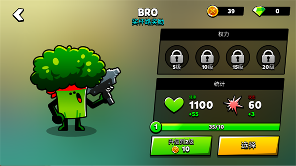 消耗金币升级西兰花战士,提升健康值与攻击力,解锁等级特权强化战力。
