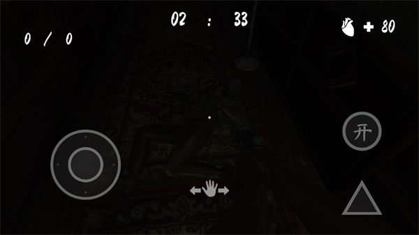 2、游戏启动后即可看到操作界面:左侧为移动摇杆,中间滑动屏幕可环顾视野,顶部显示倒计时,右上角为生命值。