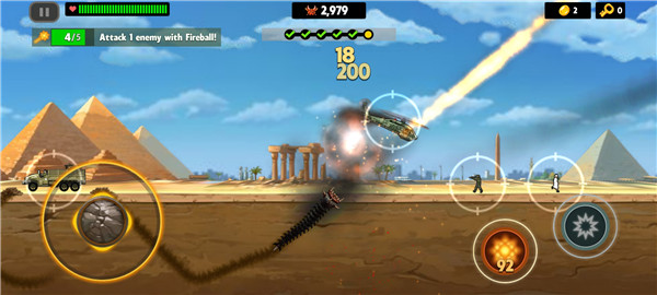 3、你需要不断的袭击上面的动物、人类以及各种车辆、飞机等人类社会的文明产物,或者获取炸弹、兴奋剂等奖励加强战斗力,并获得击杀经验值并升级。
