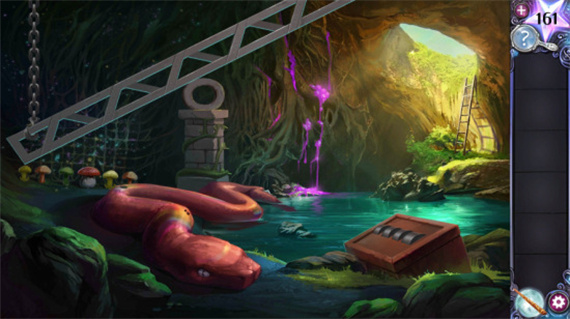 7、回到守卫室用魔法软泥将大锅填满,放入获得的蛇鳞片,然后回到洞穴向蘑菇释放肥料,让那些蘑菇生长起来将巧玲支柱撑起来,将白蘑菇生长到顶,粉红蘑菇生长两次,最后回到洞穴上方就会发现桥梁已经放下来了,就能向着沼泽出发了。