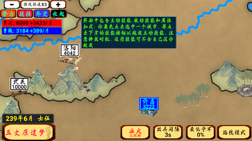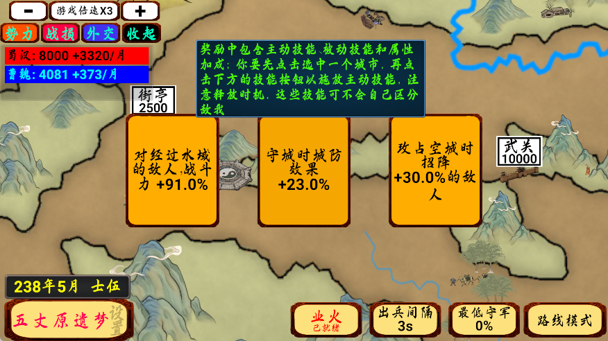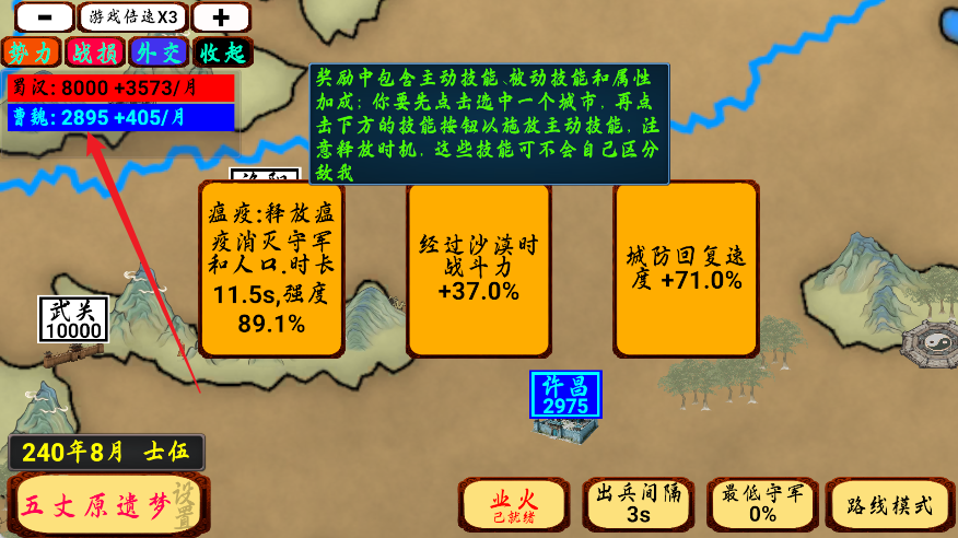4、奖励中包含主动技能、被动技能和属性加成、你要先点击选中一个城市,再点击下方的技能按钮以施放主动技能,注意释放时机,这些技能可不会自己区分故我
