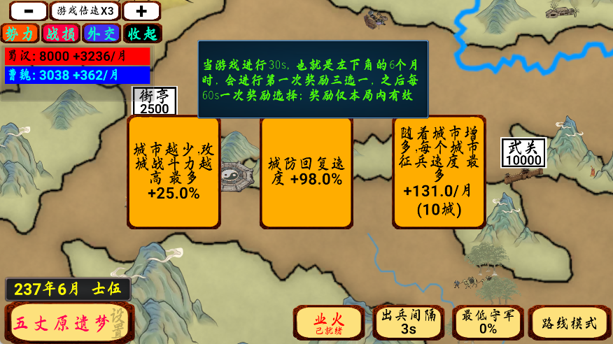 3、当游戏进行30s,也就是左下角的6个月时,会进行第一次奖励三选一,之后每60s一次奖励选择,奖励仅本局内有效