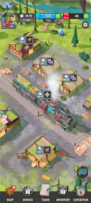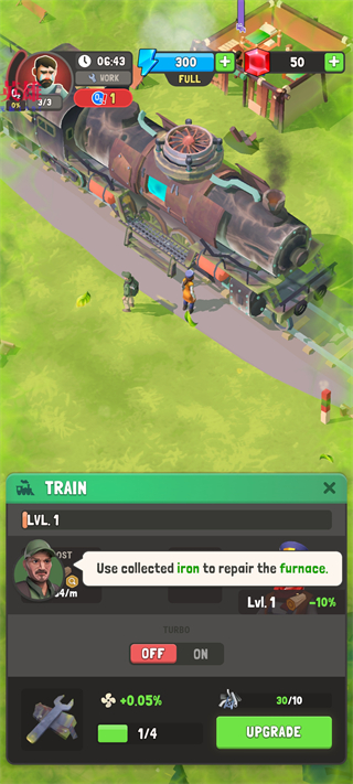 2、当收集到足够铁资源后,点击 “UPGRADE” 按钮升级列车熔炉,提升列车的基础功能。