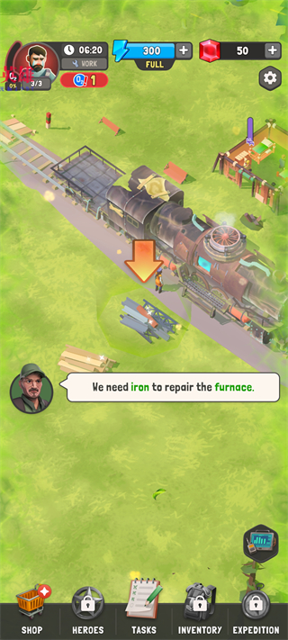 1、根据提示收集铁资源,用于修复列车熔炉,这是列车升级和运行的基础资源收集步骤。