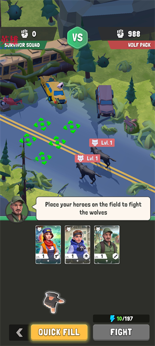 7、在收集过程中会遇到野兽,战斗时,将英雄放置在战场的绿色区域,合理部署英雄阵容来对抗狼群等敌人。