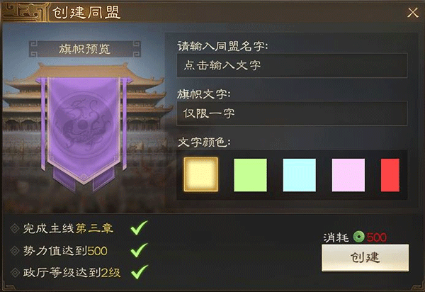 二、然后输入一个霸气的同盟名字,选择旗帜文字(仅限一字),再选择文字颜色,总共有15种,挑选你喜欢的颜色即可。