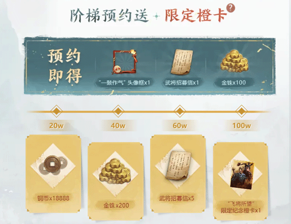 各位玩家记得预约游戏,现已有超100万玩家预约,且解锁了四档奖励,加上预约既得奖励,总计18888铜币,300金铢这些不可或缺的起步资源,还赠送六次招募机会,让新上路的玩家在三国争霸之路上开了好头。切记预约,只有做到把每一份资源用到该用的地方,才能稳步发展下去。