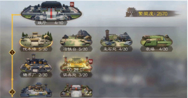 玩家在主城建设中记得用土木资源升级城池各建筑,所有建筑的核心是围绕着政厅而来的,因此需要重点提升的是政厅的等级,后续升级仓库和兵营,提升仓储上限和兵力上限,伐木采石等资源建筑按需升级,哪个资源少,优先升级拿哪个。而提升建筑等级会提高繁荣度,在前期的沃野千里活动中可以得到1500金铢,收获可观,度过到新手期,繁荣度提升逐渐困难,所以在后期资源中,繁荣度不作为获取资源主要渠道,而是以获取建设材料为主。
