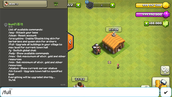 5、我们输入其中的/full就可以将村庄中的所有建筑物升级到当前大本的最高级别。