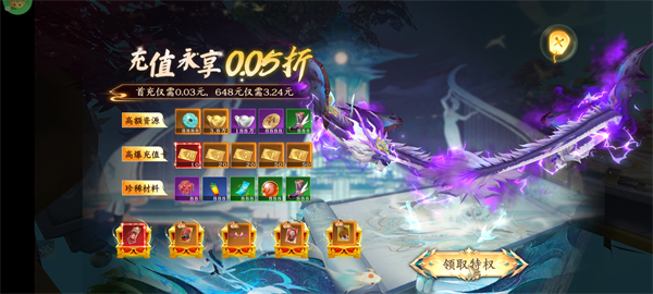 进入游戏先领取新人专属特权,首充仅0.03元、648元档仅3.24元,享0.05折+高额资源/真充卡,建议小额充值拿福利。