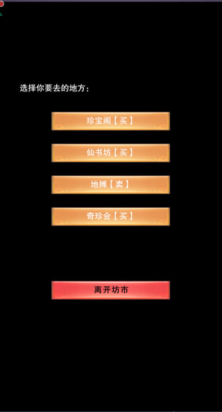 在珍宝阁中,玩家可进行丹药、丹方、玉石、图纸、门派信物的购买。珍宝阁的每日刷新时间为0点及12点,玩家的声望越高则可进入的楼层越高.在仙书坊中,玩家可进行功法的购买,购买的功法不会消耗玩家的技能点。在奇珍会中玩家可买到的物品种类较多,不论时丹药功法还是食物木材都可在此进行购买。