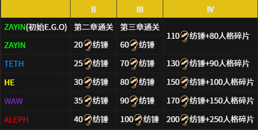● 玩家在进行异想解析时,I级与II级时仅需消耗纺锤.png纺锤来提升,而从III进阶到IV级需要额外消耗对应罪人的自我碎片。