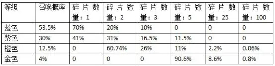 根据表格综合可进行计算可得出:假设召唤1000次NPC,按官方公示的掉率计算的话,可掉落武尊碎片2072个,其中蓝色出现535次平均每次掉落1.4个,紫色300次平均每次掉落2.1个,橙色125次平均每次3.15个,金色40次平均每次7.48个。