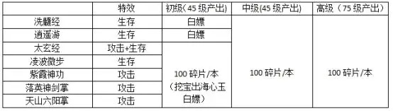 秘籍有7本,大体上也和兵魄一样,攻击属性贵一点,防御生存属性便宜一点。那么根据表格就可看出太玄经集生存攻击为一体,所以他也是价格最贵的秘籍,其次紫霞神功,落英神剑掌,天山六阳掌这三本价格其次,最后洗髓经、逍遥游、凌波微步价格最低。