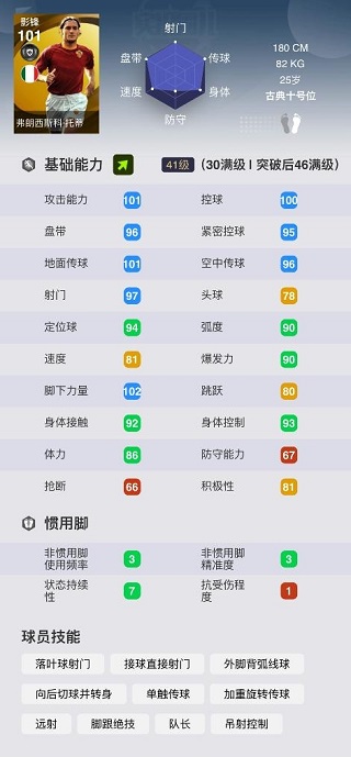 很多人可能要问了,托蒂在斜向上的时候数据已经溢出辣么多了,如果还替补上场的话岂不是有很多数据都浪费了?虽然托蒂拥有爆表的盘控,但是没有一个盘带技能为托蒂加持,在实际使用中,无论是托蒂的速度还是实际表现都不足以让他做出盘带过人的举动。