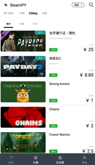 Steampy手机版是一款专门为steam玩家打造的手游交易软件,在这里你可以超低价购买、下载和玩各种类型的游戏,无论是经典的PC游戏还是最新的主机游戏,Steampy都能满足用户的需求。并且,在这里还可以查看steam代购额度、出售steam账户余额、出售cdkey等,交易过程全程由平台进行接管,能够让玩家交易更加放心,更好地避免了交易的摩擦。另外,Steampy还提供了游戏推荐功能,他会根据用户的喜好和历史购买记录,为用户推荐适合他们的游戏,这使得用户能够更加轻松地找到自己感兴趣的游戏,节省了大量的时间和精力。同时,在这里你还可以加入游戏社区,参与讨论和分享游戏心得,这种社交互动不仅增加了游戏的趣味性,也让用户能够更好地了解游戏的最新动态和攻略技巧。