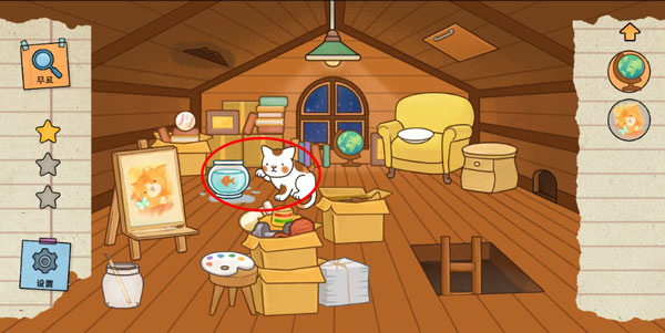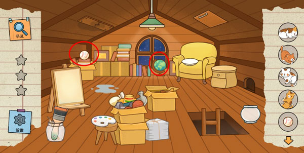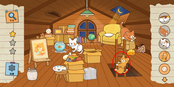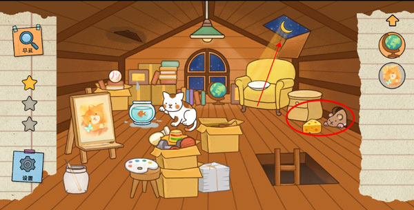 4、将房顶打开,月光照射到沙发上出现奶酪,将奶酪放在老鼠洞口会吸引一只猫咪前来