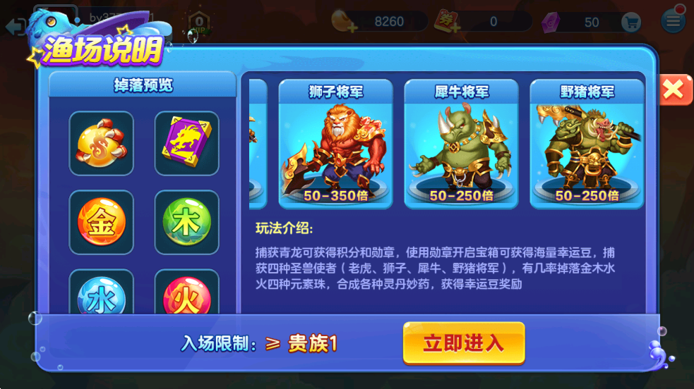特殊鱼种:青龙、老虎将军、狮子将军、犀牛将军、野猪将军