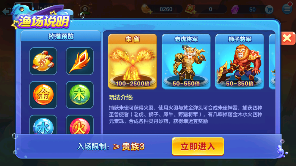 玩法介绍:捕获朱雀可获得火羽,使用火羽与黄金弹头可合成朱雀神雷,捕获四种圣兽使者(老虎、狮子、犀牛、野猪将军),有几率掉落金木水火四种元素珠,合成各种灵丹妙药,获得幸运豆奖励