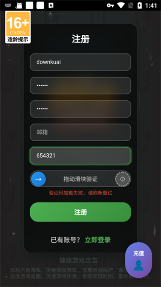 1、打开游戏,点击注册账号,【邮箱填自己的QQ邮箱,渠道填654321】