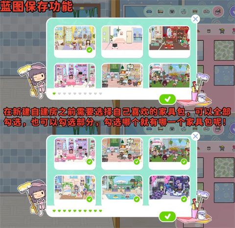 3、蓝图保存功能,在新建自建房之前需要选择自己喜欢的家具包,可以全部勾选,也可以勾选部分,勾选哪个就有哪一个家具包呢!