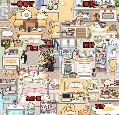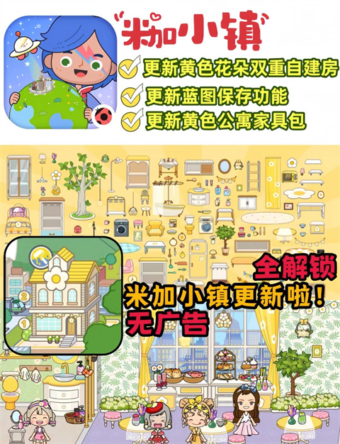 1、米加小镇更新黄色花朵双重自建房、蓝图保存功能、黄色公寓家具包。