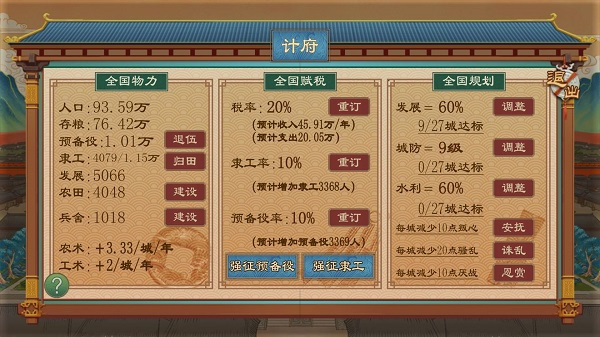 通过重订税收制度政策,可以提高国家税率,从而提高每年粮食的获取量。前期可以将税率适当调高至30%左右,在后续粮草结余较多的情况下再将其下调。