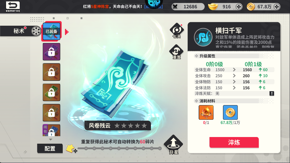 对全体敌军造成上阵武将攻击力之和5.4%的技能伤害及1200点真实伤害,每减少1个目标,伤害提升15%,暴击率提升5%,冷却时间3回合