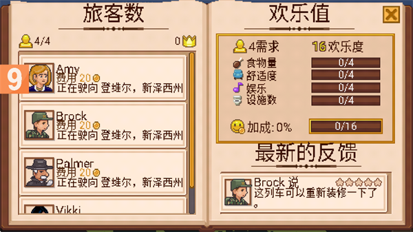 当列车抵达站点后,乘客会上下车,随后列车会自动发车,你的任务是合理管理列车,对其进行改造与升级,或通过完成任务获取餐厅车厢,在列车上售卖物品以赚取金币。