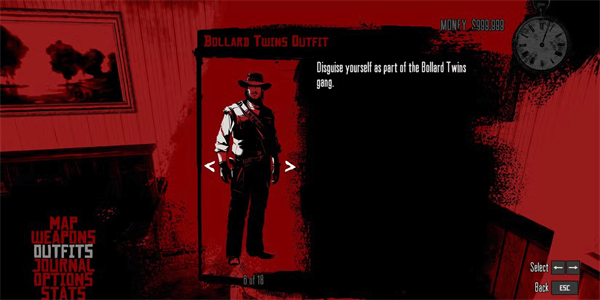 如何解锁:要找回这套服装,必须满足一系列条件:找到所有的碎片。在所罗门的愚行周围搜寻。完整的里奇伍德农场入室盗窃。在犰狳游戏中,击败所有人。带着沃尔顿帮派赏金(活着)返回。当沃尔顿帮派攻击乔拉泉时,保护它。所有的废料都去盗贼登陆的裁缝店买这套衣服。