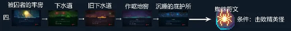 路线为:被囚者牢房→猛毒下水道→利用牧羊符文进入旧下水道→作呕地窖→沉睡庇护所→击败精英敌人后获得蜘蛛符文。