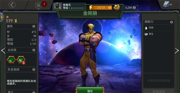 拥有强大的自愈能力,骨骼被注入艾德曼合金,使得他的身体极为强悍,难以被杀死。其标志性的骨爪可以轻易地撕裂敌人,攻击能力很强,同时也能在战斗中承受大量的伤害。